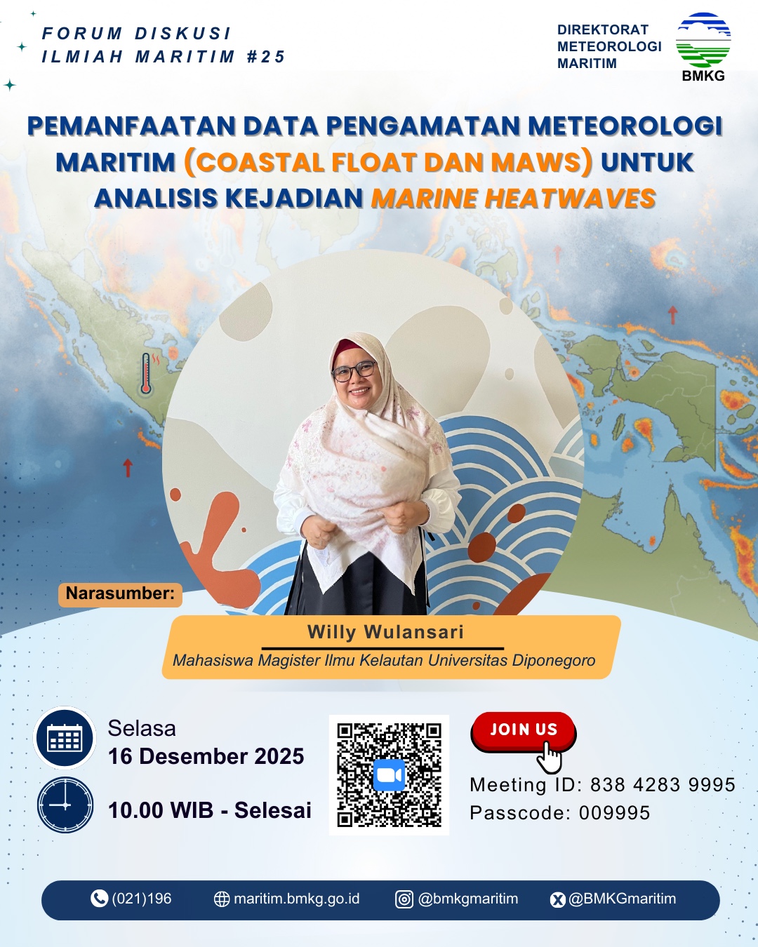 The activity formed part of the dissemination of her ongoing master’s thesis research in the field of oceanography and maritime meteorology. During the forum, Willy Wulansari delivered a presentation entitled “Utilization of Maritime Meteorological Observation Data (Coastal Float and Marine Automatic Weather Station) for Marine Heatwaves Event Analysis.” The topic highlighted the use of oceanic and atmospheric observation data as a basis for analyzing Marine Heatwaves (MHWs), which are occurring more frequently due to climate variability and change.